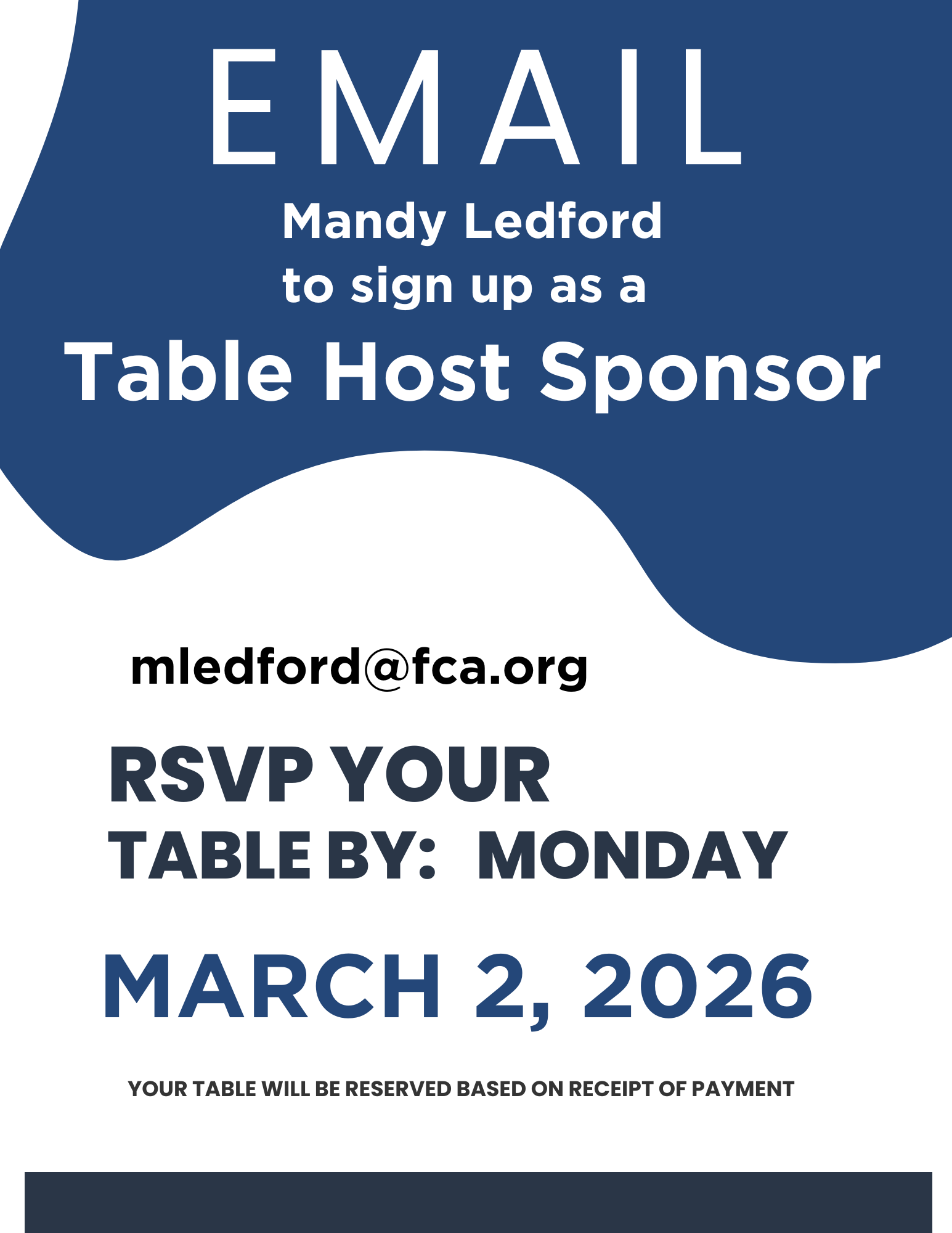 Please complete the table sponsor form and either email a copy or put it in the mail along with your check. If you email, you will be contacted for online credit card payment. Thank you for your support!